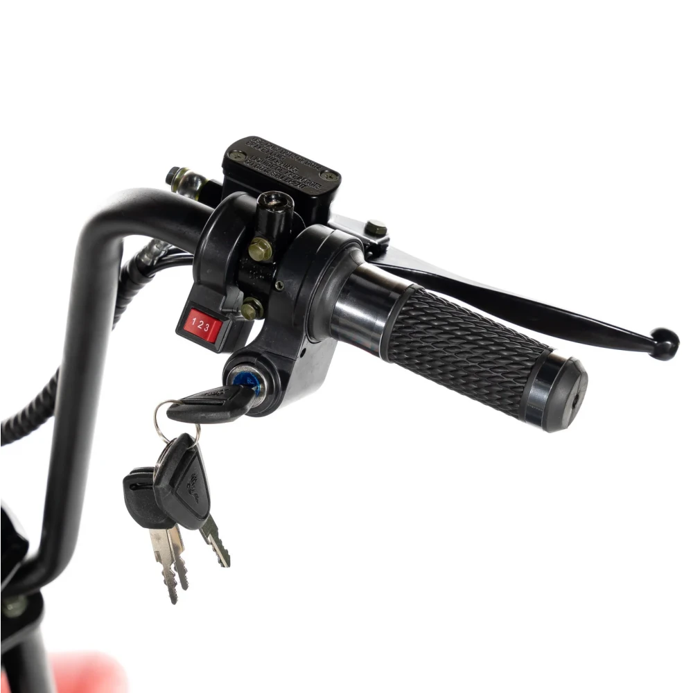 Скутер CityCoco GT X5 Trike в красной расцветке также имеет возможность регулировать скорость и направление движения, что дает большую свободу по управлению.