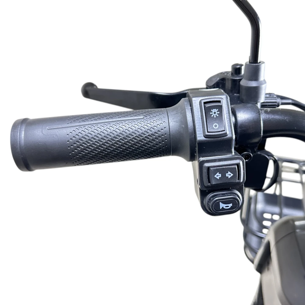 В стандартной комплектации есть зеркала, корзина, фара, стоп-сигналы и поворотники. LCD-дисплей показывает заряд, пробег и скорость, что делает поездки удобнее.