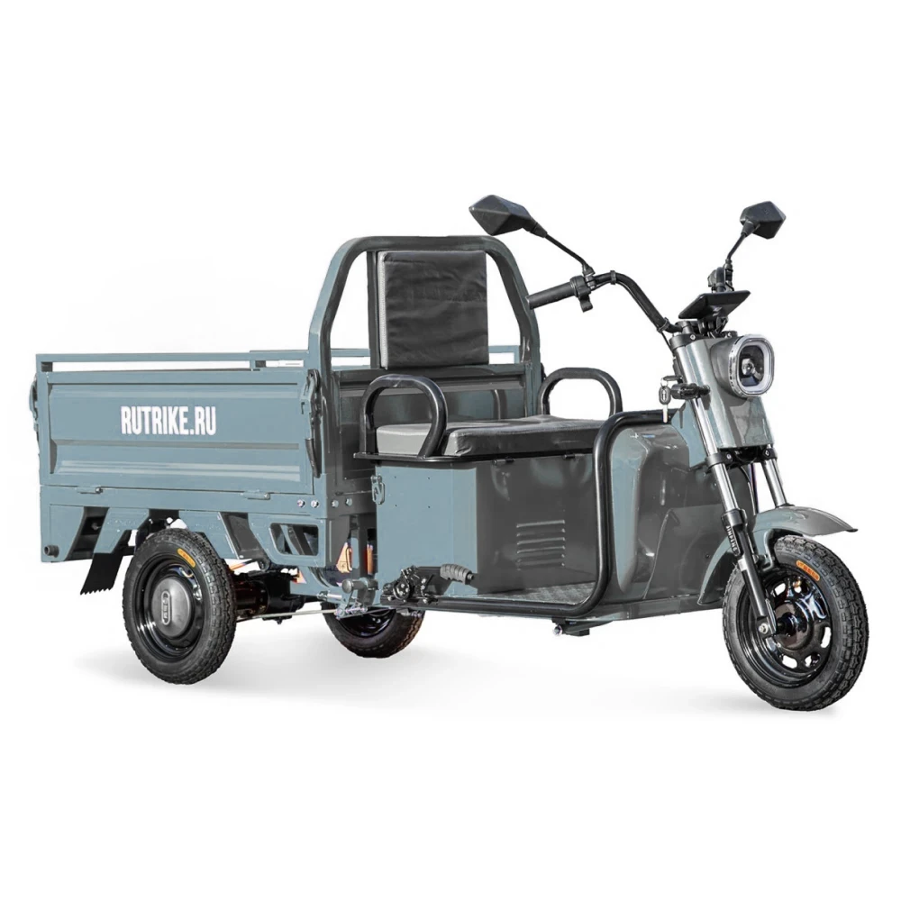 Грузовой электротрицикл Rutrike Амулет 1100 60V650W в сером цвете с мощным мотором, большим пробегом и удобным багажным отсеком является идеальным решением для тех, кто ищет надежное и эффективное средство для перевозки грузов на небольшие расстояния.