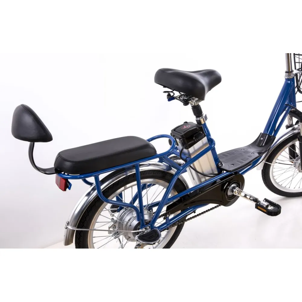 Электровелосипед массой 23 кг выдерживает нагрузку до 130 кг. Прочная алюминиевая рама из авиационного сплава надежная в применении, не деформируется при максимальных весах. АКБ с большим запасом энергии – съемное, может заряжаться на байке и без него. Велосипед имеет отдельное сиденье для пассажира, максимальная грузоподъемность – 40 кг. Наличие комфортной спинки, мягкого сиденья, не утомляет, не оказывает негативного воздействия на позвоночник.