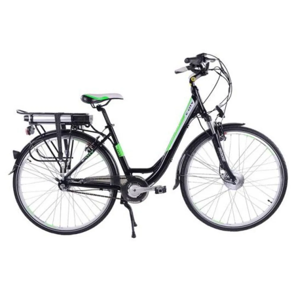 Электровелосипед Eltreco Totem Black Aqua E-City развивает максимальную скорость 35 км/ч. Имеет редукторный двигатель мощностью 240 Вт, передний привод, мотор расположен на переднем колесе. Транспортное средство достаточно маневренное, ободная тормозная система помогает контролировать движение. Вибрацию от движения по бездорожью сглаживает амортизация передней вилки. Колеса имеют диаметр 28 дюймов.