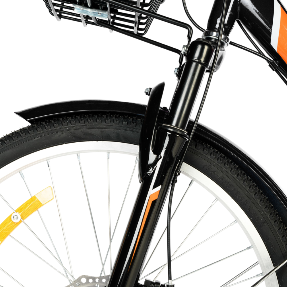 В комплекте: велосипед, насос, ключи, передняя/задняя корзины (до 15/50 кг, с замком сзади), крылья с усилителями, упоры на руле. Дополнительно: замок, фонари; апгрейдов официальных нет, совместим с универсальными (корзины, седла от других брендов).