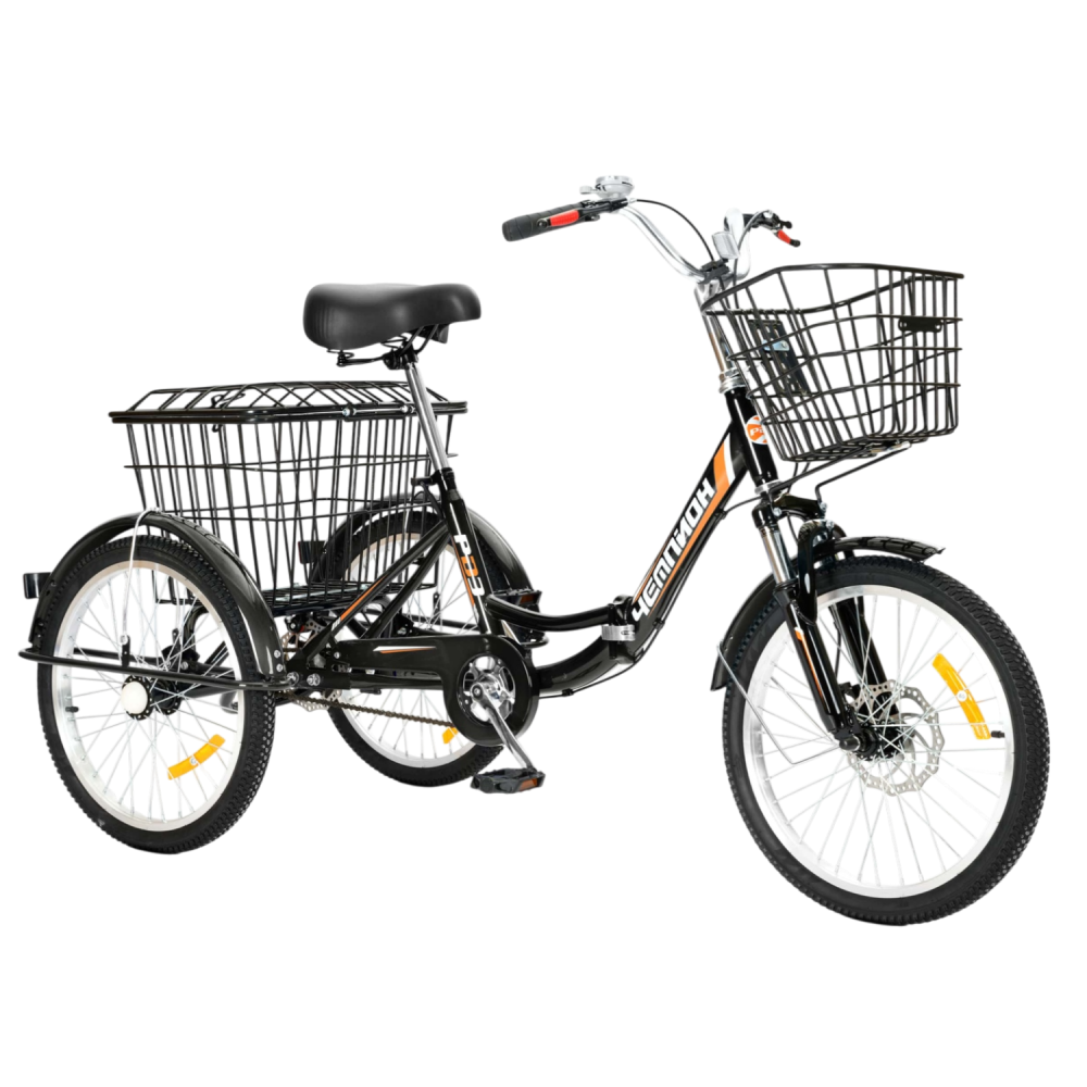 Велосипед РВЗ Чемпион 20 складной — надёжный трёхколёсный вариант для взрослых с устойчивостью и удобством хранения. Он идеален для повседневных поездок и перевозки грузов благодаря корзинам и нагрузке до 170 кг.