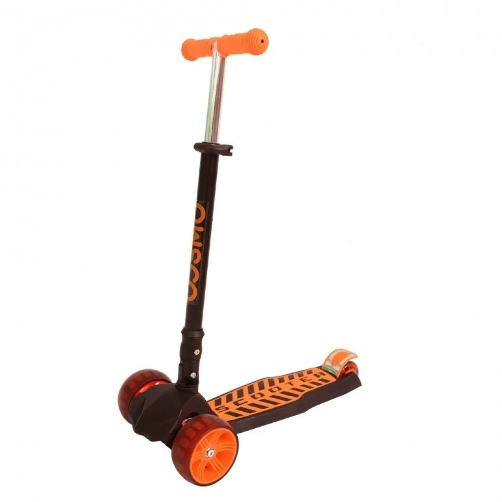 Управлять самокатом очень легко, наклоняя руль в нужную сторону. Ножной тормоз установлен на заднее колесо. С ним гарантируется моментальное торможение и безопасность катания. Колеса изготовлены из полиуретана, что обеспечивает их долговечность, делает движение плавным, смягчает неровности дороги. Также в них расположены светодиоды, которые ярко светятся при движении. За счет трех колес самокат очень устойчивый – он идеально подойдет для первого самоката малыша. Что касается размера колес, то диаметр передних составляет 120 мм, а заднего колеса – 90 мм.