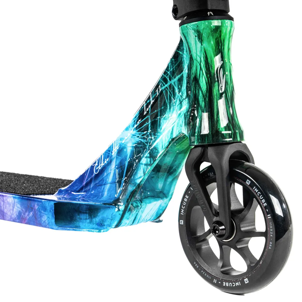 Этот самокат — настоящая находка для тех, кто стремится подчеркнуть свою индивидуальность и выделиться из толпы. Уникальная цветовая гамма «синий иридиум» создает эффект плавного перехода от синего к изумрудному, что делает каждый элемент дизайна по-настоящему волшебным. Вес модели составляет всего 2.79 кг, обеспечивая легкость и маневренность, необходимые для выполнения сложных трюков.
